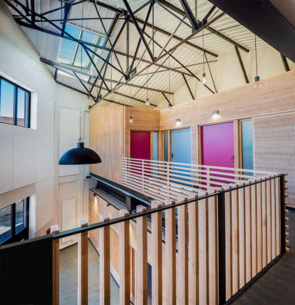 Le parti pris fut la mise en valeur du caractère industriel du bâtiment : le volume d’entrée en double hauteur, des bureaux n’atteignant pas la toiture, aménagés sous la forme de boîtes bois, une circulation de l’étage sans plafond, laissent percevoir partout la charpente métallique noire. Les menuiseries extérieures reprennent les formes de “fenêtres atelier”. Les réseaux sont volontairement laissés apparents.